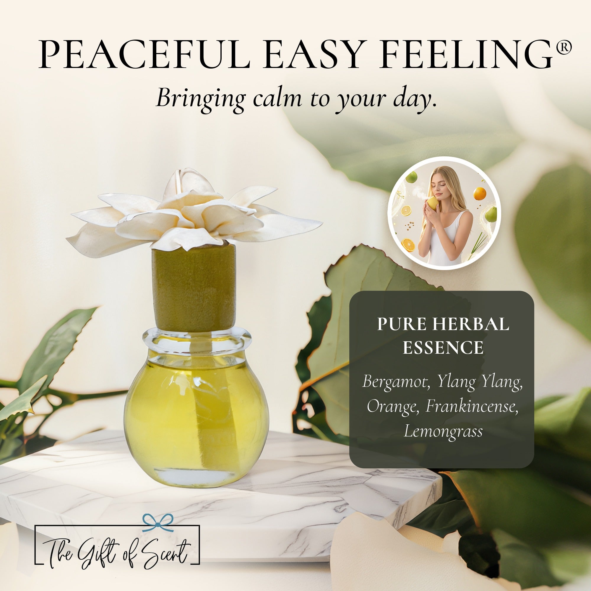 Peaceful, Easy Feeling™ – Calm and grounding: Bergamot, Ylang Ylang, Orange, Frankincense, Lemongrass