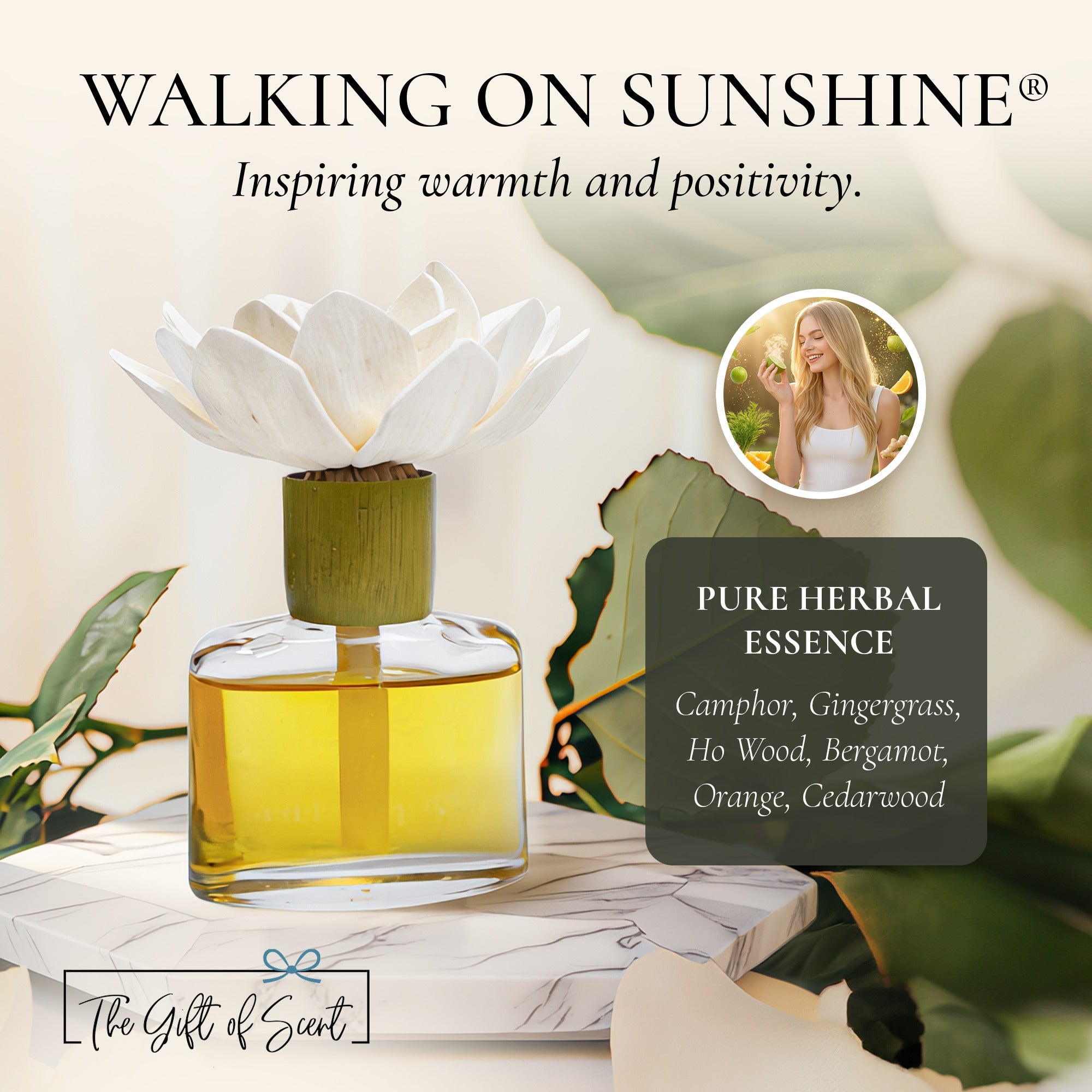 - Walking on Sunshine® – Fresh and energizing: Camphor, Gingergrass, Ho Wood, Bergamot, Orange, Cedarwood