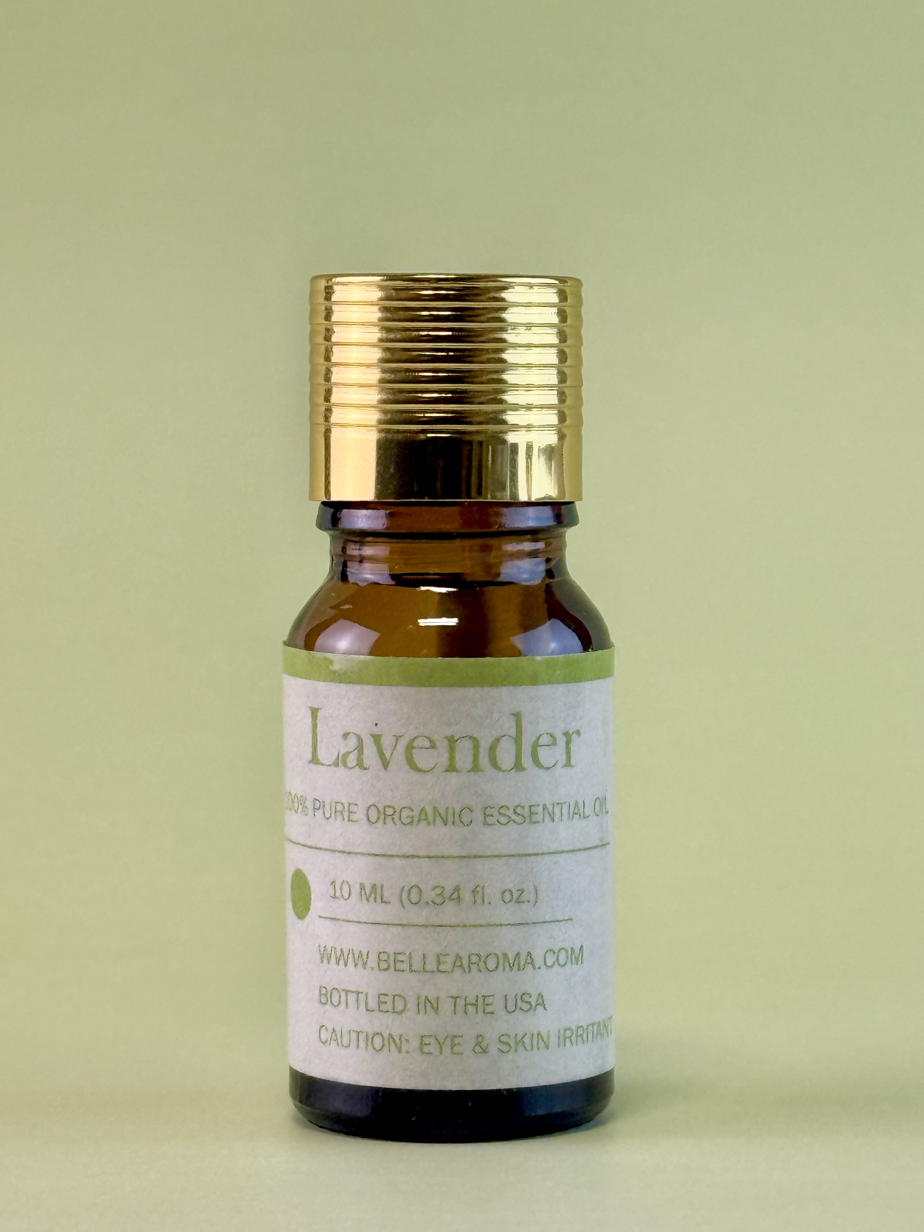 Belle Aroma 10 ml Organic Lavender essential oil, amber bottle with gold lid.