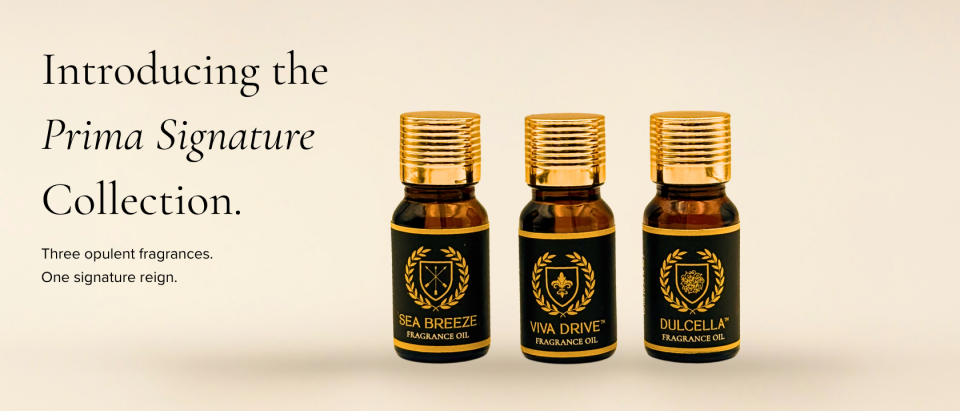 The Prima Signature Collection celebrates the art of scent as self-expression — a trio of exclusive fragrance oils crafted to define, delight, and endure. From the radiant warmth of Viva Drive, to the breezy elegance of Sea Breeze, to the sweet allure of Dulcella, each fragrance invites you to leave a lasting impression that feels entirely your own. Three opulent fragrances. One signature reign.
